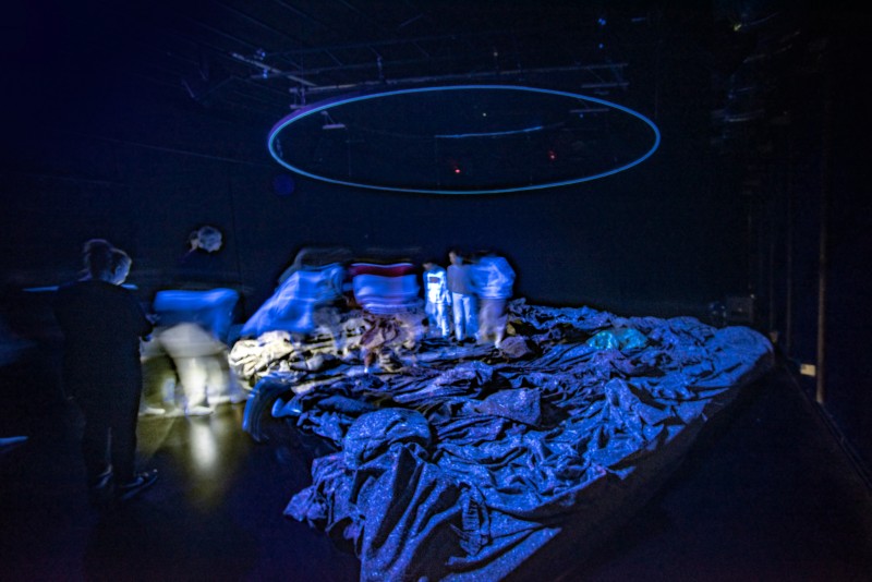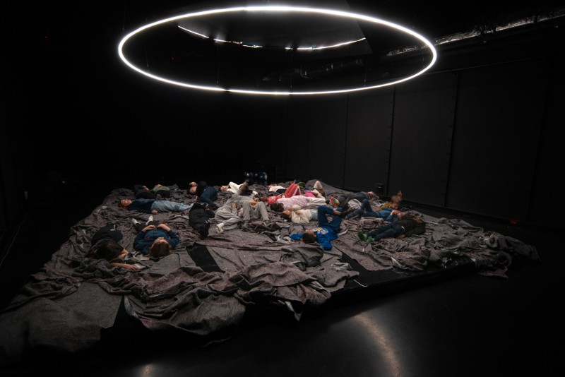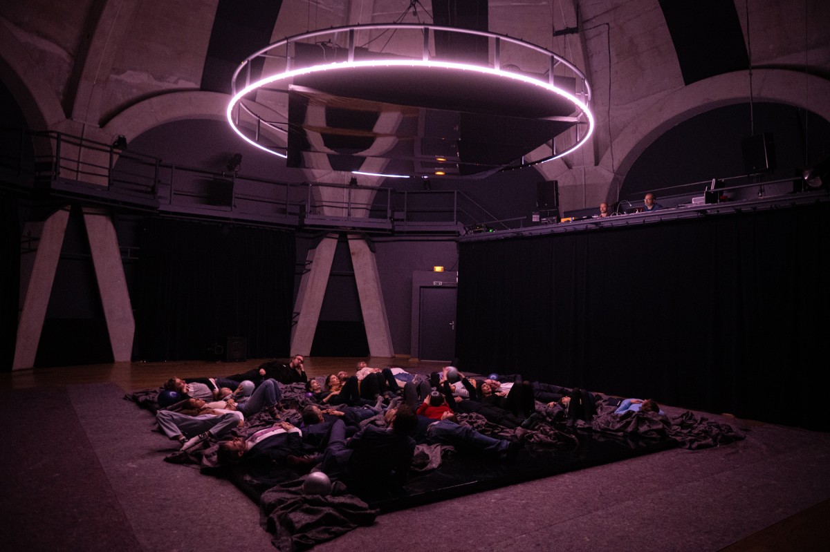 L’imaginaire est ici convoqué par la voix et par une multi-diffusion : enceintes et plateau vibrant sur lequel le public vient se déposer. Ce dispositif crée des espaces de perceptions propres à nous faire voyager dans un état hypnagogique (entre éveil et sommeil), à convoquer un Nous plus vaste.